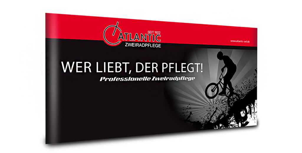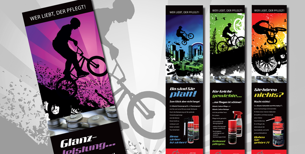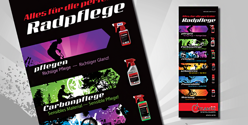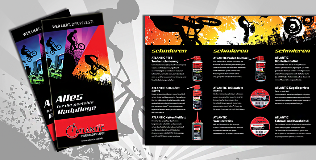 Atlantic Oil steht für Fahrradpflege – vom Reiniger bis zur Kettenpflege. Unsere Aufgabe: ein sportiver, dynamischer Auftritt, der am PoS auffällt und sich durchgängig von Anzeigen über Plakate und Messewände bis zur Produktverpackung und Flyerserie zieht.